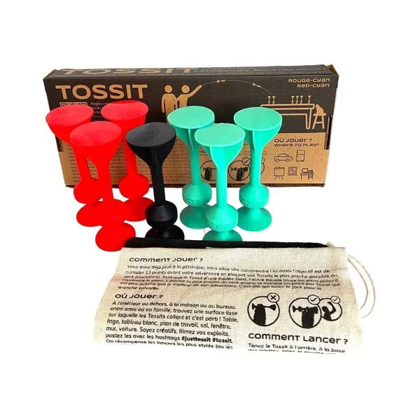 Tossit : Rouge – Cyan est un jeu d’adresse original et fun qui mélange pétanque et fléchette. Lancez des fléchettes ventouses en silicone sur une cible au sol ou au mur. Pour 2 à 6 joueurs, à partir de 5 ans, 15 minutes, édité par Tossit.
