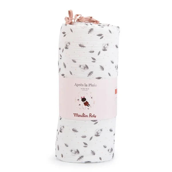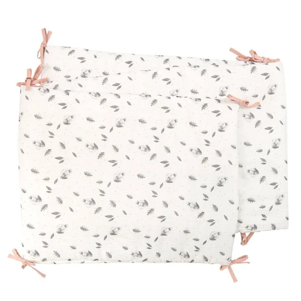 Tour de lit double épaisseur, en lange 100% coton pour une grande douceur. Il habille le lit de bébé avec son tendre motif de lapin endormi au milieu des feuilles d’automne, imprimé sur un tissu crème, et souligné par un biais et des lanières roses.