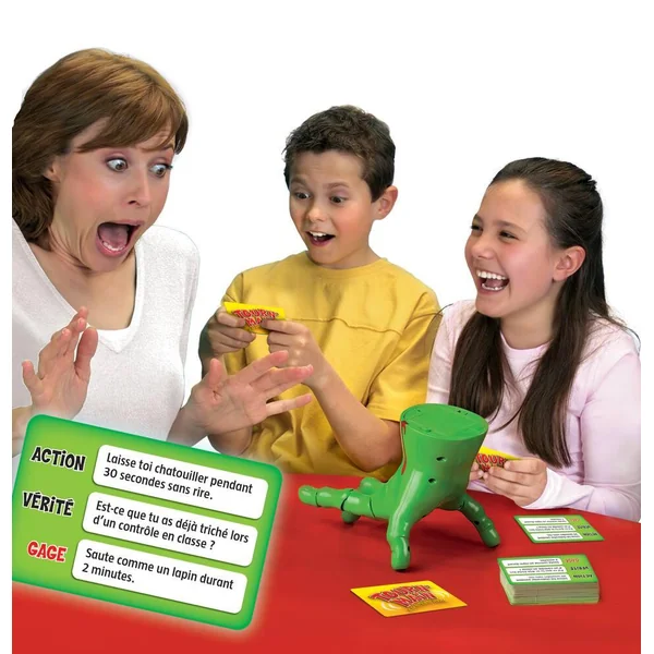 Une main (de taille réelle) se déplace seule sur la table. lorsqu’elle s’arrête, son index se tend et désigne un des joueurs qui devra choisir : action ou vérité ? Sinon ce sera un gage ! Un jeu où les enfants vont adorer être montrés du doigt ! Contenu : 1 main articulée électronique, 100 cartes, 1 règle de jeu – A partir de 2 joueurs.