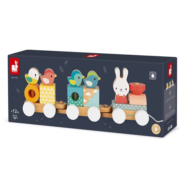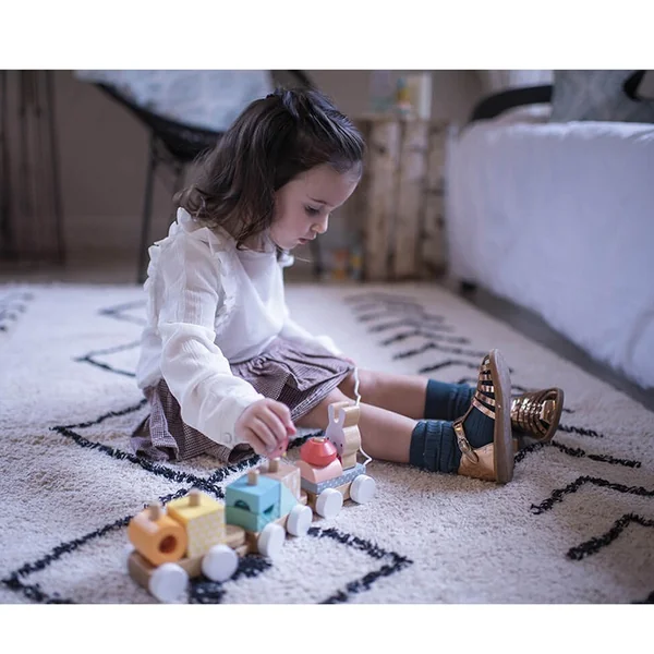 Ce train en bois est aussi composé de 17 blocs de formes et couleurs différentes, et d’animaux trop mignons qui voyagent à bord du train et seront les compagnons favoris de bébé.