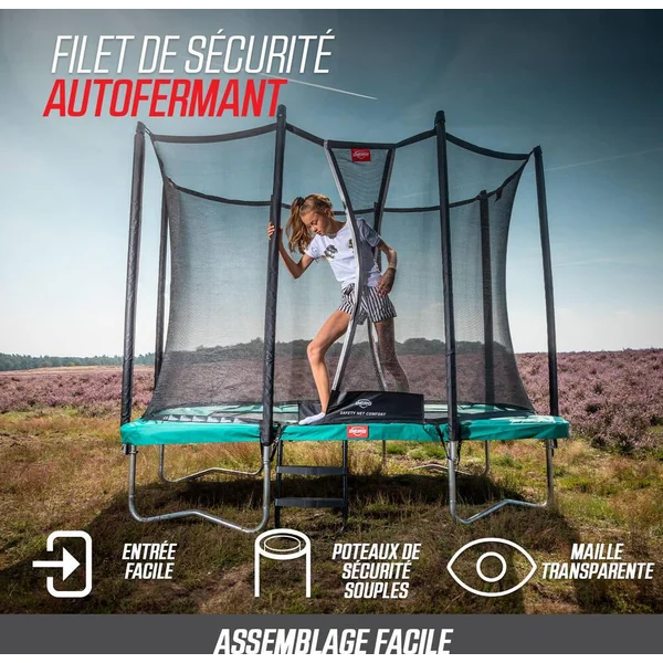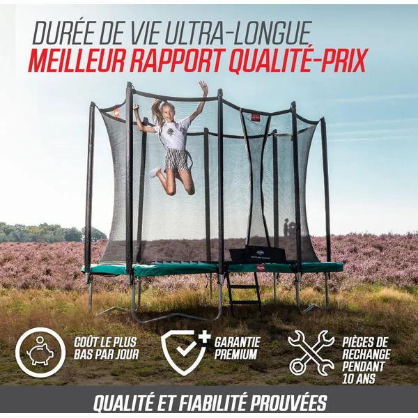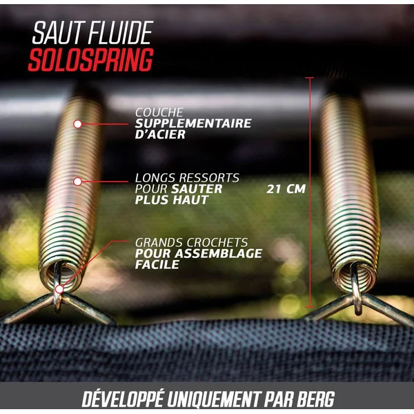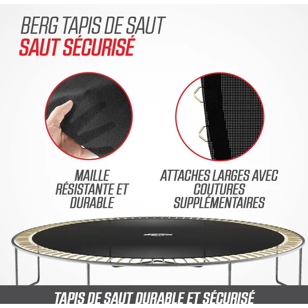 Tous ces sauts ne vous lassent jamais? Aucun problème! Le BERG Favorit vous procure des années de plaisir, s’use à peine et nécessite peu d’entretien. Le BERG Favorit a été conçu avec beaucoup de soin et d’attention. Le résultat en vaut la peine; c’est un trampoline d’excellente qualité et très sûr.Toile de saut.Tapis de saut durable en propylène tissé très résistant. Les boucles de ces robustes trous métalliques des ressorts sont solidement fixées avec 8 séries de coutures. Grâce à la structure à mailles ouverte, le tapis de saut ne se réchauffe pas et ne brûle pas les pieds.Goldspring Solo Les trampolines de toutes les tailles de la ligne Favorit sont équipés de ces ressorts. C’est pourquoi on rebondit si confortablement sur ces trampolines. Le confort de saut sur ces trampolines est beaucoup plus élevé que sur la précédente ligne de BERG Talent avec ressorts GoldSpring Talent.BERG RegularSi vous ne voulez pas creuser de trou dans le jardin, il est préférable de choisir un trampoline haut. Un trampoline haut est très facile à installer et à changer de place. En outre, un trampoline haut se voit bien dans le jardin.Un trampoline rondLe cadre d’un trampoline rond est très solide. Quand on rebondit sur un trampoline rond, on revient toujours vers le milieu. C’est au milieu d’un trampoline rond que l’on rebondit le plus agréablement. La raison en est la suivante: c’est au milieu que les ressorts et le cadre répartissent mieux les forces du saut.