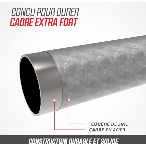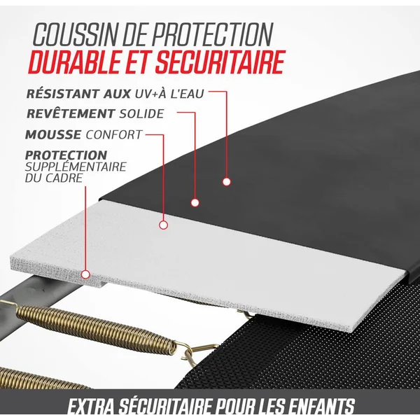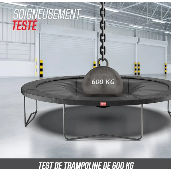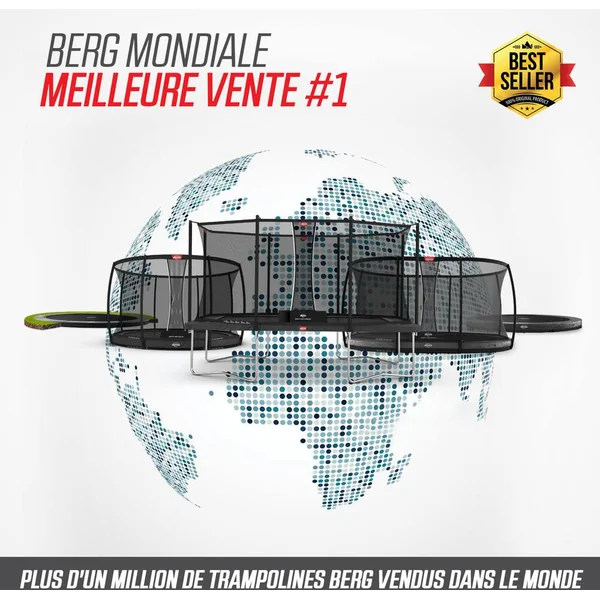 Tous ces sauts ne vous lassent jamais? Aucun problème! Le BERG Favorit vous procure des années de plaisir, s’use à peine et nécessite peu d’entretien. Le BERG Favorit a été conçu avec beaucoup de soin et d’attention. Le résultat en vaut la peine; c’est un trampoline d’excellente qualité et très sûr.Toile de saut.Tapis de saut durable en propylène tissé très résistant. Les boucles de ces robustes trous métalliques des ressorts sont solidement fixées avec 8 séries de coutures. Grâce à la structure à mailles ouverte, le tapis de saut ne se réchauffe pas et ne brûle pas les pieds.Goldspring Solo Les trampolines de toutes les tailles de la ligne Favorit sont équipés de ces ressorts. C’est pourquoi on rebondit si confortablement sur ces trampolines. Le confort de saut sur ces trampolines est beaucoup plus élevé que sur la précédente ligne de BERG Talent avec ressorts GoldSpring Talent.BERG RegularSi vous ne voulez pas creuser de trou dans le jardin, il est préférable de choisir un trampoline haut. Un trampoline haut est très facile à installer et à changer de place. En outre, un trampoline haut se voit bien dans le jardin.Un trampoline rondLe cadre d’un trampoline rond est très solide. Quand on rebondit sur un trampoline rond, on revient toujours vers le milieu. C’est au milieu d’un trampoline rond que l’on rebondit le plus agréablement. La raison en est la suivante: c’est au milieu que les ressorts et le cadre répartissent mieux les forces du saut.