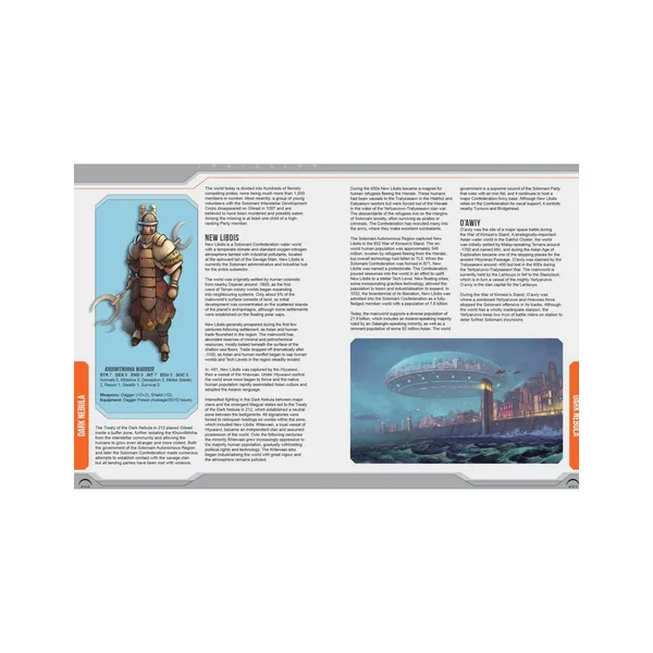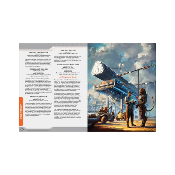 La nébuleuse sombre doit son nom à la mystérieuse nébuleuse de Celella, un phénomène de l’espace de saut qui a dévoré les astrologues pendant des millénaires. Le secteur abrite également Kusyu, la planète natale des Aslan et le cœur spirituel de leur Hiérarque, qui s’étend sur plusieurs étoiles. The Deep and the Dark offre également une vue d’ensemble de la politique complexe et changeante du Hiérat et de la nature de la culture Aslan.