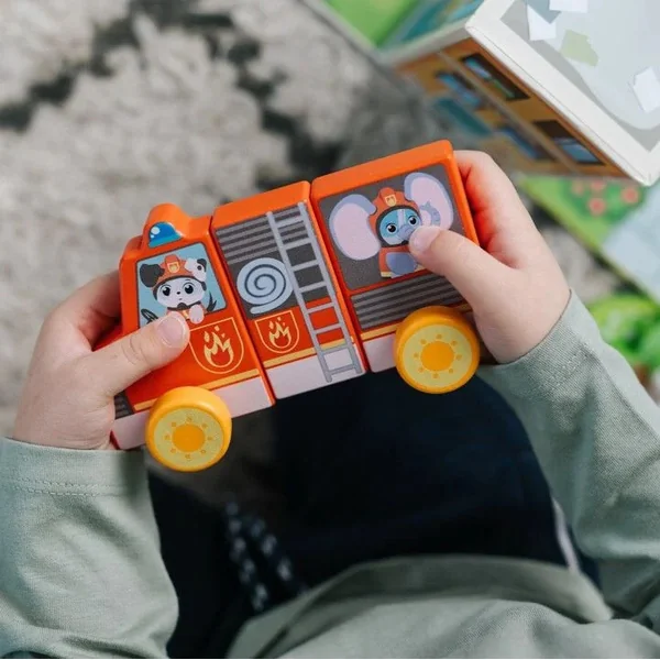 Véhicule magnétique : Le camion de pompiers de Tiny Tails est un jouet en bois unique. Le camion de pompiers se compose de trois éléments reliés magnétiquement et de roues pivotantes. Les parties magnétiques peuvent être mélangées et connectées à d’autres véhicules de la série, révélant encore plus de possibilités de jeu !