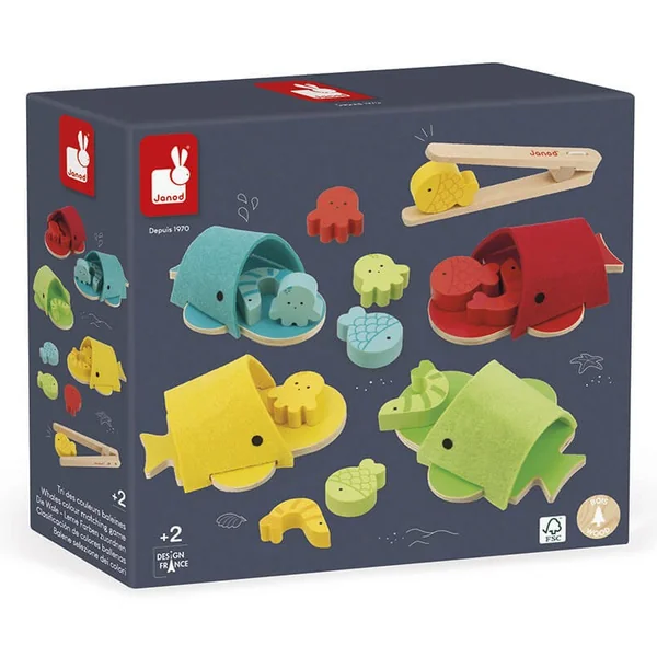 Baleines colorées cherchent festin pour se régaler ! Avec ce jeu de tri des couleurs, les enfants à partir de 2 ans vont pouvoir se familiariser avec les couleurs tout en développant leur motricité fine !