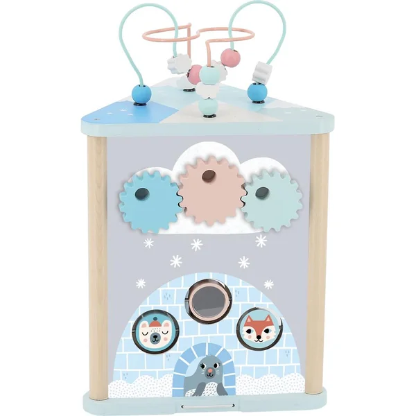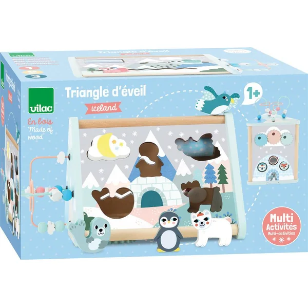 Ce triangle d’éveil, illustré avec douceur par Michelle Carlslund, plonge les petits dans le monde de la banquise. Posé comme une tente ou à la verticale, chaque face regorge de surprises pour développer la motricité des enfants. Que de choses à découvrir : des engrenages à actionner, des petites têtes à pivoter, un hibou et un renard à faire voyager, un cylindre de neige à faire tourner et des perles et nuages à déplacer sur un fil ! Dans l’igloo de l’ours, une petite porte latérale avec des charnière élastiques permet à l’enfant de récupérer les pièces qu’il aura encastrées sur un des côtés. Avec de nombreuses activités variées, ce triangle d’éveil en bois est un incontournables dans l’univers des petits.