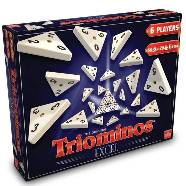 Cette version apporte un véritable plus aux amateurs de Triominos. 20 tuiles supplémentaires viennent s’ajouter aux 56 pièces de base pour pouvoir jouer à 6. Ces 20 nouvelles tuiles tournent dans le sens inverse des aiguilles d’une montre ajoutant ainsi une importante dimension stratégique. Composition du lot : 76 Triominos, 6 réglettes, 1 règle de jeu.