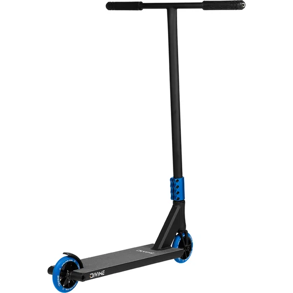 Divine Nyx est une trottinette freestyle conçue pour les riders intermédiaires/avancés mesurant entre 165 et 195 cm, qui souhaitent s’améliorer en street riding. L’ensemble de la trottinette pèse 4,4 kg, ce qui est un excellent rapport compte tenu de sa taille. La trottinette est équipée de guidons en acier en forme de T avec des poignées douces. Les guidons sont maintenus ensemble par un système à quatre vis SCS, qui, associé à une fourche en aluminium monobloc, maintient l’ensemble du scooter et assure un fonctionnement silencieux. La trottinette roule magnifiquement grâce aux roulements industriels montés dans le cou de la planche. La planche est excellente par ses dimensions, son espace pour les pieds, son extrémité carrée et son frein en plastique. La trottinette est équipée de deux roues de 120 mm avec des moyeux en aluminium.