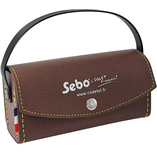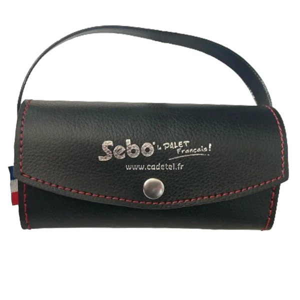 Trousse en cuir pour le transport et le rangement d’un jeu de palets en fonte.