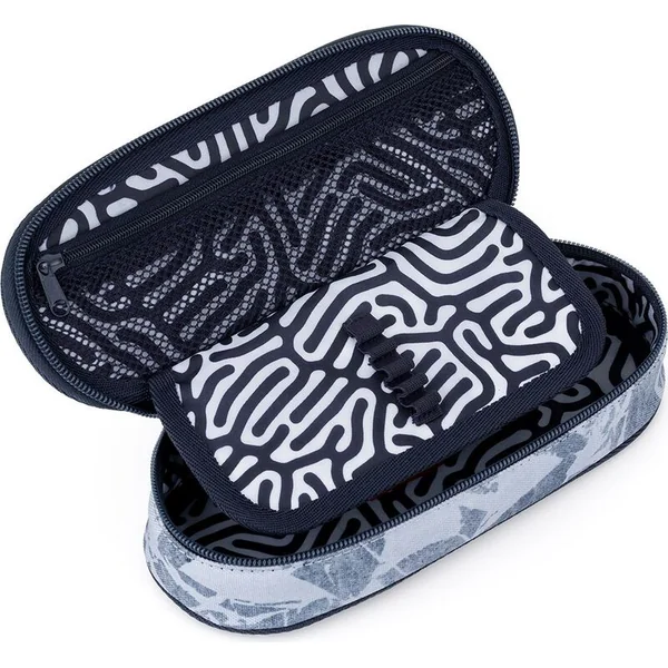 À l’intérieur de la trousse, il y a une poche en filet avec une fermeture éclair et un rabat, sur lequel sont placés des élastiques pour maintenir un total de neuf fournitures d’écriture, qui doivent être organisées de manière claire à portée de main. L’espace sous le rabat permet de placer librement d’autres fournitures d’écriture – crayons de couleur, marqueurs, et divers petits objets.