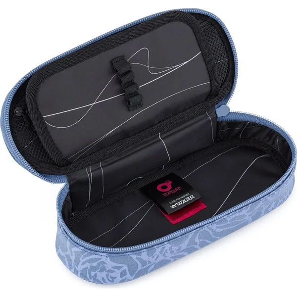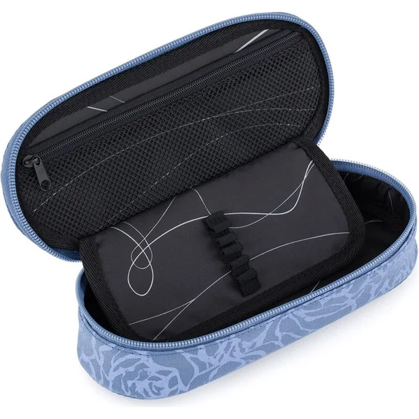 À l’intérieur de la trousse, il y a une poche en filet avec fermeture éclair et un rabat, sur lequel sont placés des élastiques pour maintenir un total de neuf fournitures d’écriture, qui doivent être à portée de main de manière organisée. L’espace sous le rabat permet de placer librement d’autres fournitures d’écriture – crayons de couleur, marqueurs, et divers petits objets.