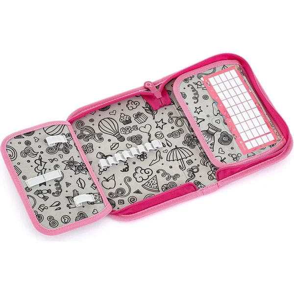 Le trousse scolaire à une chambre avec deux rabats est équipée de 21 supports en caoutchouc classiques pour crayons et feutres, de trois supports plus larges pour règles, compas ou ciseaux, et de deux plus grands supports pour gomme et taille-crayon. Sous le rabat en film transparent, vous trouverez un emploi du temps, mais cela peut également servir par exemple pour des antisèches 😉