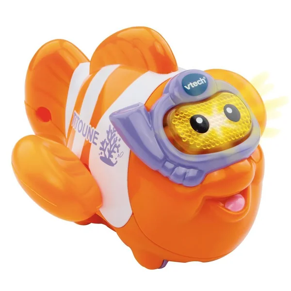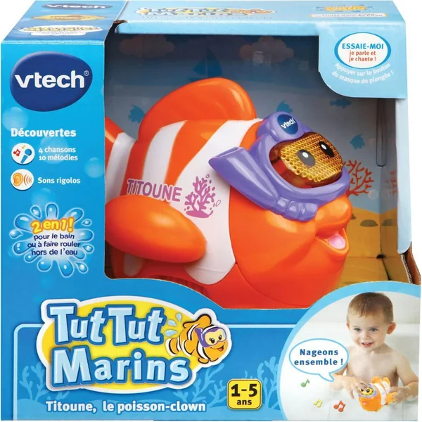 Tut Tut Marins. Bateaux et Animaux. De 1 à 5 ans. Des animaux et des bateaux interactifs pour des heures de jeu dans le bain ! Ils flottent sur l’eau et peuvent aussi s’utiliser sur le sol grâce à leurs petites roues. Les Tut Tut Marins parlent, chantent et s’illuminent comme les autres Tut Tut. L’enfant peut également manipuler certaines parties (pinces du crabe, nageoires…). Un bouton lumineux en forme de visage rigolo déclenche 4 chansons, des phrases et des effets sonores réalistes. Ils sont compatibles avec le système de détection « Aquaclips magiques » qui déclenche des phrases et des sons supplémentaires. 4 chansons rigolotes et 10 mélodies. Différents modèles : Adam le pirate des océans, Maxime police maritime, Norbert sauvetage en mer, Lili jolie otarie, Corail le poisson tropical, Titoune le poisson-clown, Pikou le crabe pince-tout, Gaspard le gentil petit canard. Pile de démonstration fournie