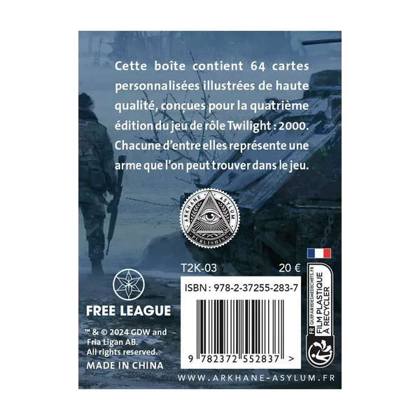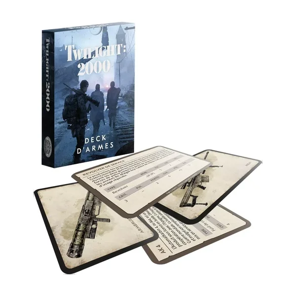 Conçu pour immerger un peu plus les joueurs dans l’univers de Twilight 2000, Le Deck d’armes est une boîte contenant 64 cartes personnalisées et illustrées. Chacune d’entre elles représente une arme que l’on peut trouver dans le jeu.