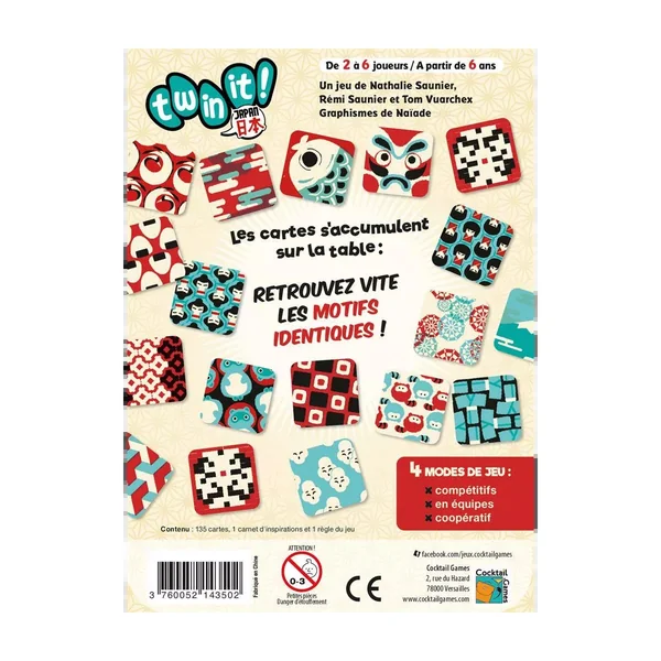 Retrouvez un jeu d’observation et de rapidité à travers 4 modes de jeu complémentaires : compétitifs, en équipes et coopératif ! Cette version de Twin It est une édition dédiée à la culture japonaise. Elle contient un carnet d’inspirations des superbes illustrations de Naïade.