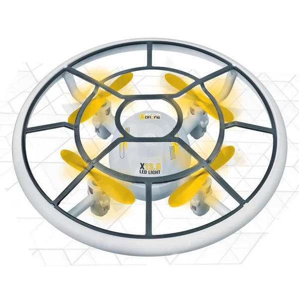 Drone avec structure protectrice et lumineuse. 4 canaux, 3 vitesses et gyroscope. Fréquence : 2,4 GHz. Comprend 1 batterie Li-Poly 3,7V 350 mAh rechargeable (par câble USB inclus). Fonctions headless (pas de commandes inversées) et hover (vol stationnaire). Portée : 50 mètres. Usage intérieur. Poids du drone + batterie : 35 g. Catégorie : C0. Age recommandé 8 ans.