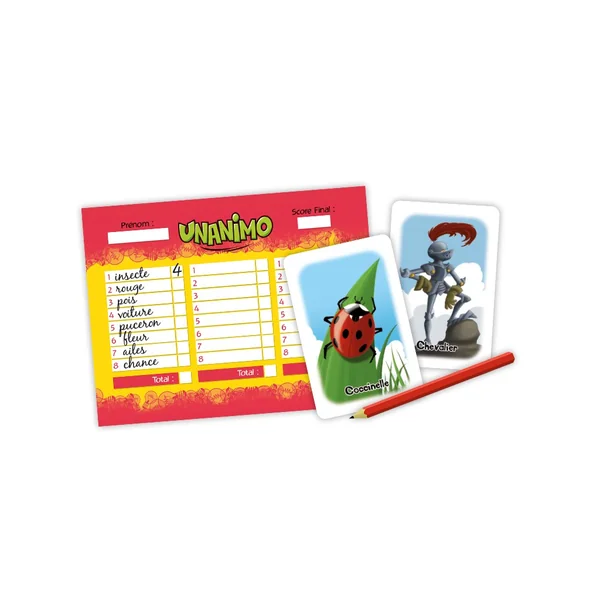 Contenu : 54 cartes, 1 bloc de feuilles de score et 4 crayons