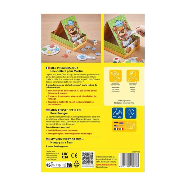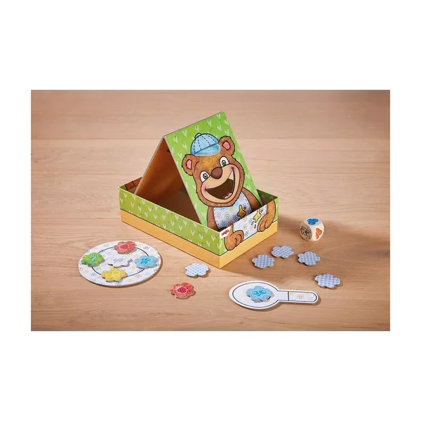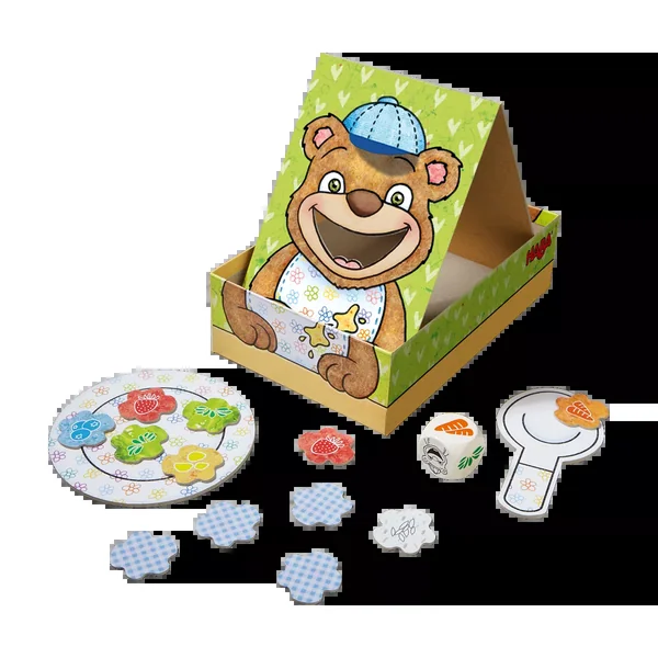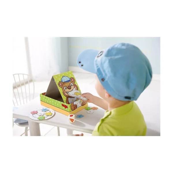 Dans Une cuillère pour Martin, le petit ourson a très faim. Heureusement qu’une assiette avec différentes bouillies est déjà prête. Mais avec quelle bouillie faut-il nourrir le petit ourson ? C’est le dé qui va l’indiquer.