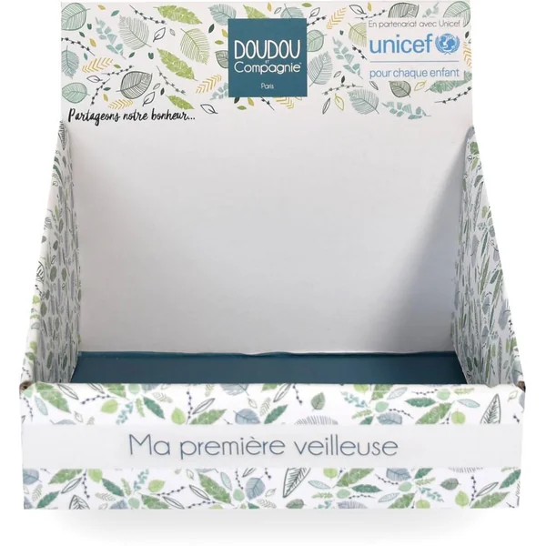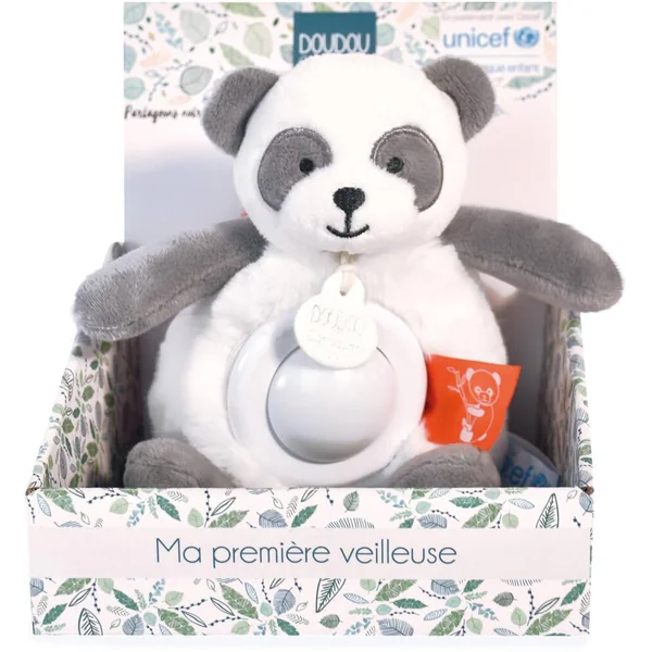 Grâce à cette collection, imaginée exclusivement par Doudou et Compagnie pour UNICEF, chaque veilleuse vendue permet de récolter des fonds pour Unicef, pour ensemble continuer à faire avancer les droits de l’enfant. Cette nouvelle création, tendre et douce, nous rapproche ausssi de l’essentiel: la nature. Protéger les enfants du monde, c’est aussi protéger leur avenir en se sensibilisant à la préservation de la faune et de la flore. Cette veilleuse PANDA blanc et gris est bien pratique pour rassurer bébé. Avec sa partie veilleuse amovible, elle devient vite un petit Doudou facile à manipuler et à nettoyer. Elle est présentée dans une jolie boîte au motif végétal raffiné. Elle est lavable à 30°. Un cadeau idéal dès la naissance. Inédit ! Ce produit bénéficie de LA GARANTIE DOUDOU. Grâce à son numéro unique, Doudou perdu est vite retrouvé ! Enregistrez votre Doudou et découvrez toutes les garanties sur le site doudouetcompagnie.com.