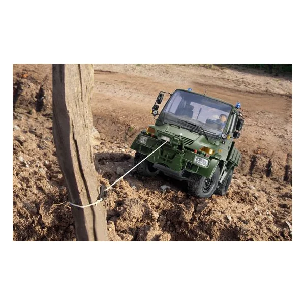 Le son original du moteur est joué par le module son qui dispose de hautparleurs intégrés. Des pneus caoutchouc très adhérents sécurisent le comportement routier, dans le cas ou le Unimog serait bloqué, le cable treuil permet de facilement dégager le camion par lui‐même. Le kit est complet, incluant la batterie de propulsion de l’Unimog, le chargeur, les accus pour l’émetteur. Le Unimog n’a pas besoin d’équipement supplémentaire.
