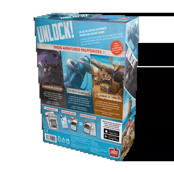 L’application gratuite Unlock !, compatible avec les téléphones et tablettes Android et iOS, est nécessaire pour jouer. Elle permet d’obtenir des indices, de repérer des objets cachés, mais aussi d’entrer les codes découverts. Elle contribue également à l’ambiance avec ses musiques dédiées à chaque aventure, ses énigmes audio, ses terribles pénalités et son compte à rebours fatal !