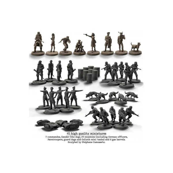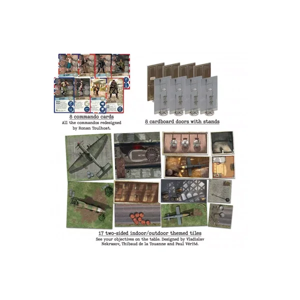 • 45 figurines de haute qualité • 16 tuiles recto verso • 8 cartes de commandos • 37 pions • 1 livret de règles • 8 portes avec socle Cette boîte de jeu est bilingue, anglais + français.