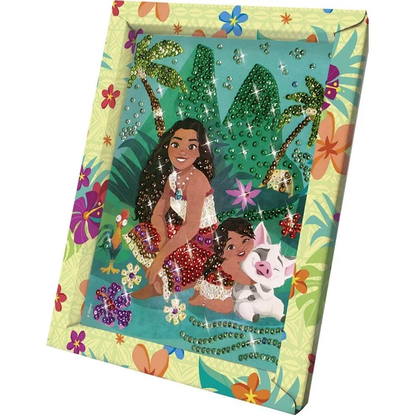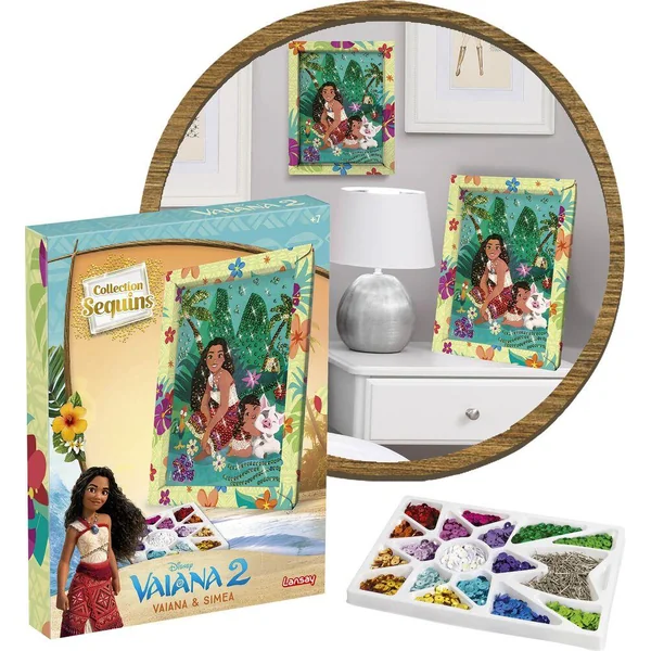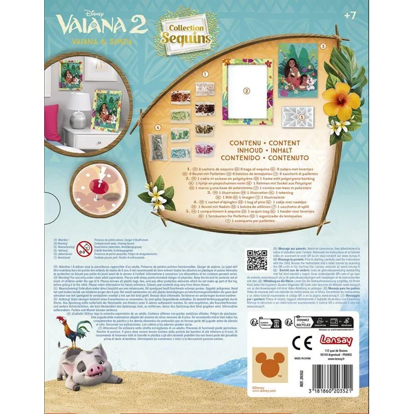 Réalise des créations étincelantes avec Collection Sequins! Dans ce kit, tu trouveras l’illustration de Vaiana & Simea dans son cadre, avec une plaque de polystyrène qui sert de base pour fixer les sequins à l’aide de petites épingles.