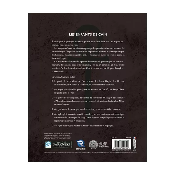 Ce livre réunit de nouvelles options de création de personnages, de nouveaux pouvoirs, des conseils pour jouer ensemble, seul ou en distanciel et de nouvelles manières d’utiliser les anciennes règles. C’est le compagnon parfait pour Vampire : la Mascarade, cinquième édition.