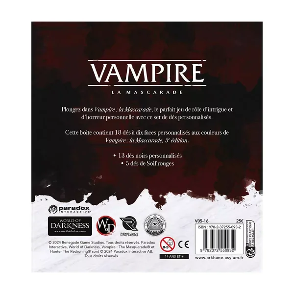 Vampire la Mascarade V5 : Set de Dés est un accessoire de jeu de rôle édité par Arkhane Asylum contenant 18 dés.