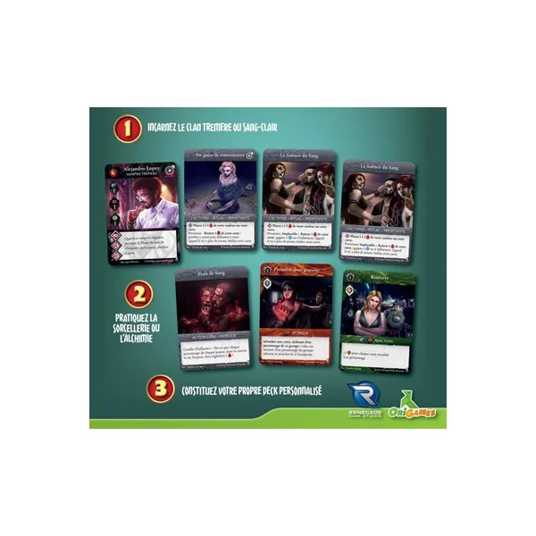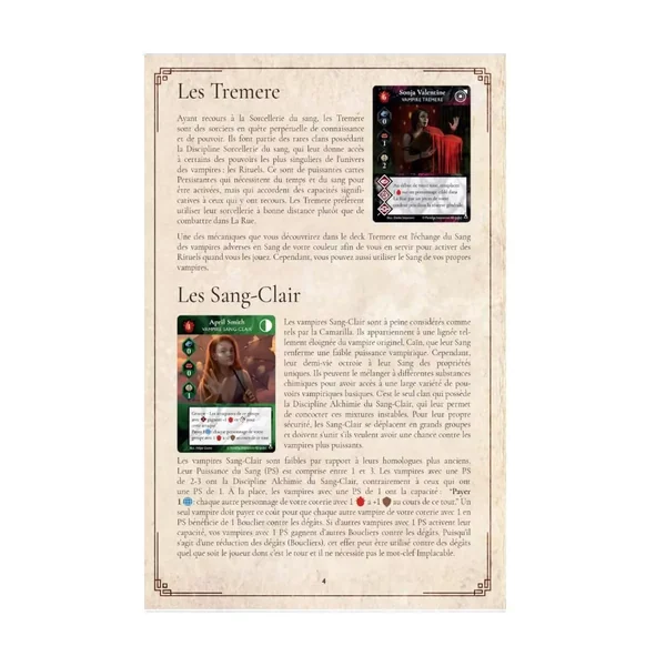 Vampire Rivals : Sang et Alchimie – Extension : Les vampires Tremere et Sang-Clair constituent des clans totalement opposés, aux deux extrémités du spectre. Maîtres de la Sorcellerie du sang, les Tremere puisent dans leur sang une incroyable puissance tandis que les Sang-Clair doivent le mélanger à pléthore de substances chimiques pour en extraire leur pouvoir.