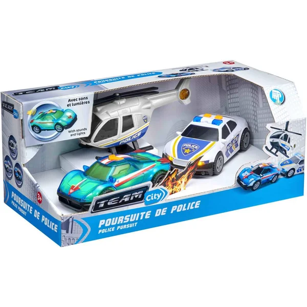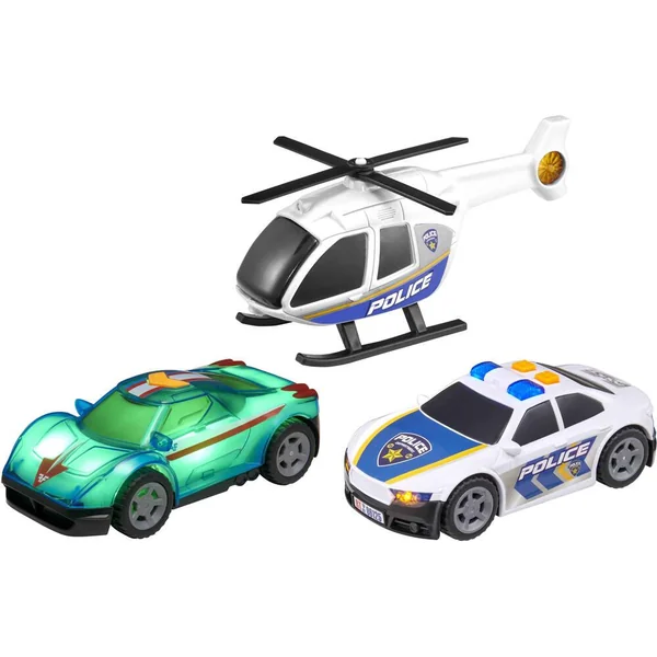 Attrape le criminel et protège ta ville avec le coffret de jeu poursuite de police ! Cet ensemble comprend une voiture lumineuse qui change de couleur avec des sons futuristes et des bruits de moteur, un hélicoptère de police avec des pales d’hélice à rotation manuelle et une voiture de police dotée de lumières clignotantes et de sons d’urgence. Le cadeau parfait pour tout petit conducteur enthousiaste, offrant des heures de plaisir imaginatif ! Fonctionne avec 6 piles boutons (LR44) incluses. Fonction Try Me.