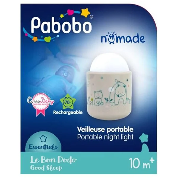La veilleuse rassurante à emporter partout. La veilleuse Nomade, c’est la première veilleuse portable sans pile ni fil, vraiment pensée pour les enfants. Avec sa petite lumière, elle rassure les parents qui peuvent veiller sur leur tout-petit sans le réveiller. Et comme elle est aussi compacte que légère, elle tient dans la main : les plus grands peuvent trouver leur chemin dans le noir, tout seul, sans réveiller leurs parents. La veilleuse nomade se recharge directement sur une prise et peut éclairer jusqu’à 70 heures, soit une semaine d’autonomie ! En plus, on n’a même pas besoin de l’allumer ou de l’éteindre. Elle s’adapte toute seule à la lumière ambiante. Comme une grande ! Rassurante : idéale pour veiller sur les plus petits sans les réveiller. Portable : compacte et légère pour que les plus grands trouvent leur chemin dans le noir. Infatigable : une fois retirée de la prise, elle offre une semaine (70h) d’autonomie ! Intelligente : elle s’allume et s’éteint toute seule. La bonne idée Pabobo : la première veilleuse portable qui s’adapte à la lumière ambiante !