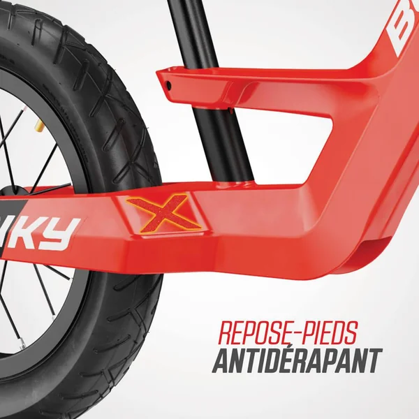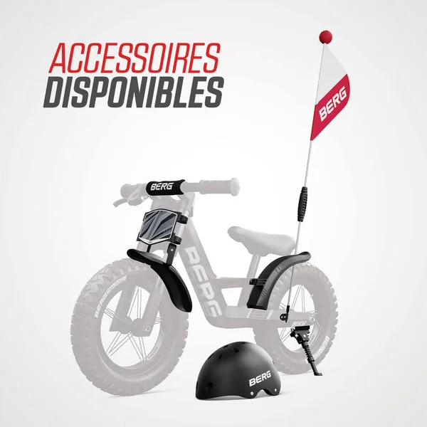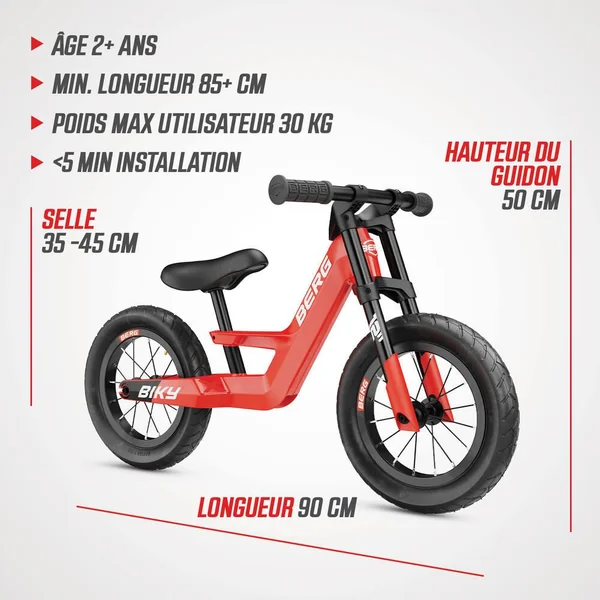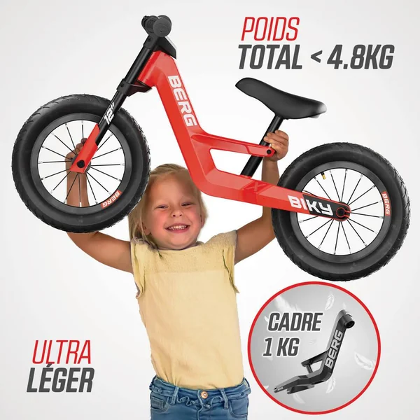 Le design distinctif et la double fourche avant font du BERG Biky un modèle solide et attrayant. Le vélo est fabriqué en magnésium léger, dispose d’une rotation sécurisé du guidon, d’une selle réglable et de pneus confortables. En appliquant les dernières techniques de production et en utilisant du magnésium léger, BERG a pu développer un cadre particulièrement robuste avec un poids très faible. Cela rend le vélo très facile à manier, mais surtout très agréable à conduire.L’importance d’une bonne ergonomieAvec son entrée basse et sa selle réglable en hauteur, le Biky est facilement accessible et convient aux enfants d’une taille de 85 cm à 120 cm. La pince de selle est intégrée dans le cadre et peut être facilement actionnée avec la clé Allen fournie. Cela te permet d’ajuster facilement et en continu la bonne hauteur.Direction controleeUn vélo d’équilibre est la meilleure préparation pour faire du vélo tout seul. Se tenir en équilibre sur deux roues et (apprendre à) diriger en même temps est tout un défi à un jeune âge. Pour éviter un « pliage » inattendu du guidon, nous avons équipé le BERG Biky d’un limiteur d’angle de braquage qui est réglable avec un mode pour les débutants et un mode avancé.