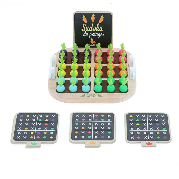 Sudoku de légumes pour les plus petits ! L’objectif du jeu est simple : vous devez placer les légumes en bois dans le jardin selon l’une des cartes, puis remplir les cases vides selon les règles du sudoku.