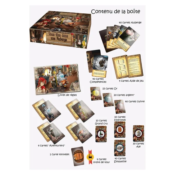 Chaque joueur incarne un des quatre aventuriers du jeu : Le Chevalier, Le nain, L’Elfe et le Hobbit; chacun possédant de l’argent et des talents qui lui sont propres . A tour de rôle, les joueurs vont en premier lieu passer au comptoir pour commander des cartes “Boisson” grâce à l’argent de leur bourse. Chaque achat leur permettra d’acquérir aussi des cartes “Sympathie”. Puis ils passeront du bon temps en acquérant des cartes “Auberge” grâce aux différentes boissons et pièces en leur possession.