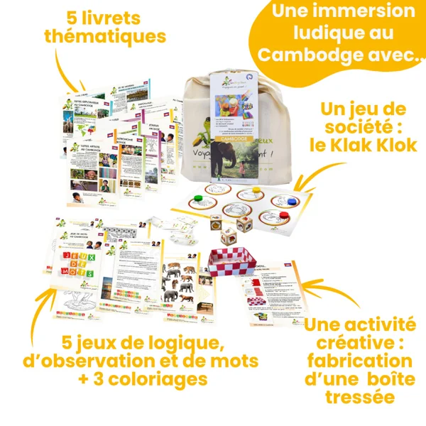 Le pochon Voyageons en jouant Cambodge contient de multiples activités ludiques et éducatives pour un « VoyaJeux » insolite :