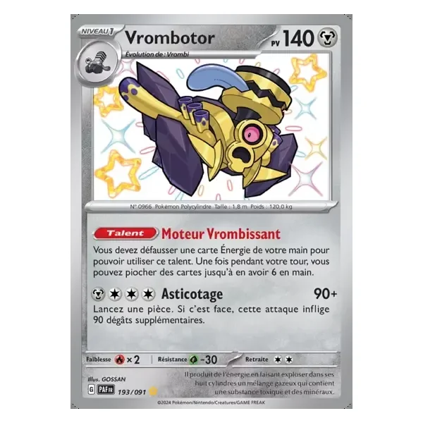 Découvrez Vrombotor (paf193), une carte Pokémon de l’extension Destinées de Paldea, provenant du bloc Écarlate & Violet. Idéale pour compléter votre collection, cette carte Shiny Rare plaira autant aux collectionneurs qu’aux joueurs.