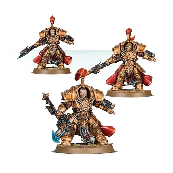 Les Allarus Custodians se déploient avec une fureur subite pour saisir l’armée ennemie à la gorge. S’il faut réduire une place forte, aborder un navire renégat ou abattre un vil démagogue au milieu de ses gardes du corps, on lâche les Allarus Custodians. Ces guerriers sont nantis d’armures Terminator Allarus, dont la valeur peut excéder celle d’un monde. Leurs armes sont tout aussi impressionnantes, des lances de gardien deux fois plus grandes qu’un homme, ou des haches de castellan qui peuvent décapiter un psyker ork d’un coup. Les Allarus Custodians éliminent les cibles clefs, sèment la confusion et le désordre chez les forces adverses et déstabilisent complètement les formations ennemies.