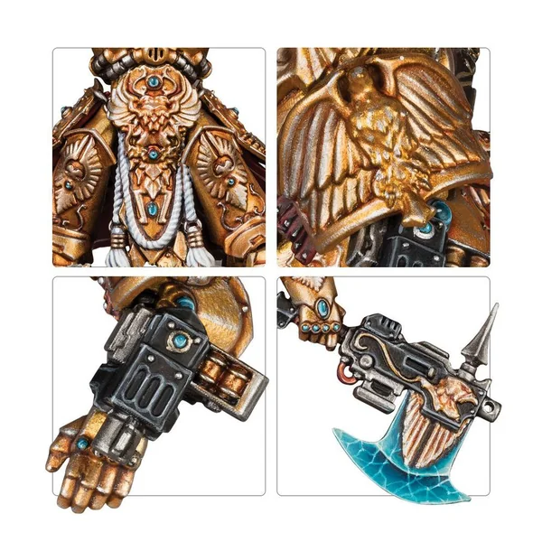 Ce kit plastique contient les composants nécessaires pour assembler une escouade de 3 Allarus Custodians. Chacun d’eux porte une armure Terminator Allarus, un chef d’œuvre couvert de symboles de l’Empereur sculptés, avec des aigles impériaux, des éclairs, des gemmes et des filigranes à foison. Leur armement standard comprend une hache de castellan et un lance-grenades Balistus d’avant-bras – et il y a de quoi équiper les trois figurines avec des lances de gardien. Le kit comprend aussi 4 dagues dites miséricordia, dont une spéciale pour Shield-Captain. Il y a 3 heaumes et 3 têtes nues, plus 4 plumets.