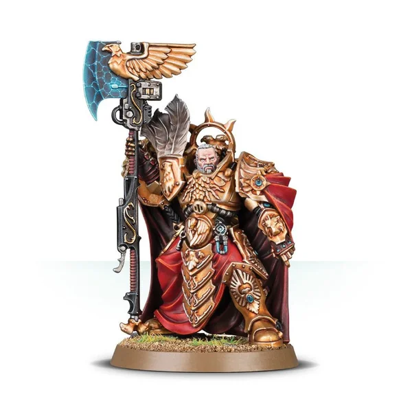Ce kit plastique contient les composants nécessaires pour assembler le Captain-General Trajann Valoris. Son armure est encore plus élaborée et spectaculaire que celle de ses frères Custodiens – il porte la Plate du Castellan, une antique armure énergétique dont l’écu arbore une tête d’aigle et un plumage splendide. Ce à quoi s’ajoute une cape magnifique en peau de lion tissée de fil dur comme le diamant – la tête et les pattes avant du lion ornant l’épaulière droite. Un halo d’auramite encadre son visage dur, et l’armure dans son ensemble est sculptée avec le genre de détails qui distinguent l’Adeptus Custodes des autres guerriers impériaux – des aigles, gemmes et filigranes à foison. De la main droite, il tient son arme principale, la Hache du Guetteur, une haste énorme qui incorpore une arme à bolts de maître appelée Cri de l’Aigle; il porte aussi à la ceinture une misericordia et une relique ancienne, le Joug de l’Instant.