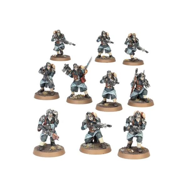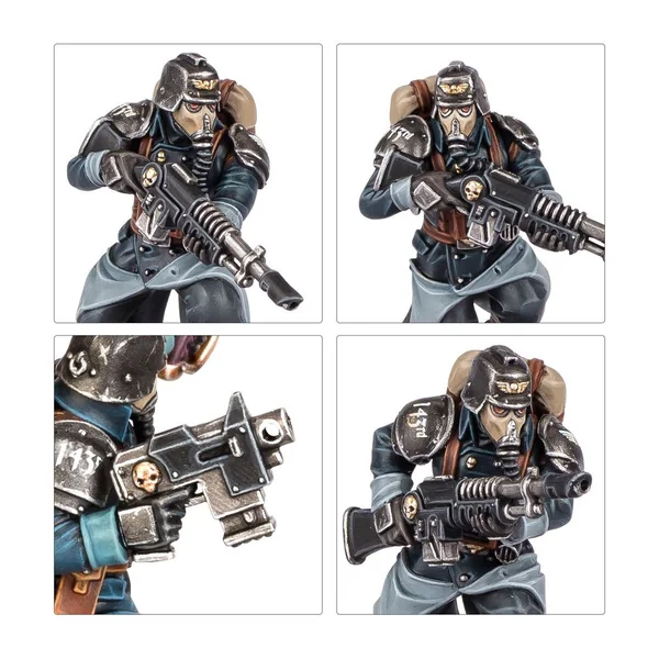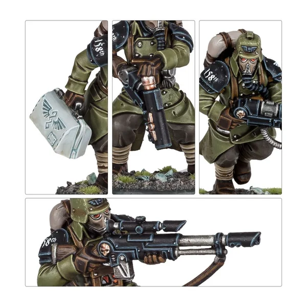 Ce kit est extrêmement flexible, avec des tas d’options pour personnaliser votre unité. Une figurine peut être assemblée comme Maître du Guet, armé d’un pistolet à plasma, d’un pistolet laser, ou d’un pistolet bolter, et d’une épée tronçonneuse ou d’une arme énergétique dans l’autre main. Une figurine peut être équipée d’un fusil laser long de tireur d’élite, une autre d’un lance-flammes, une d’un lance-grenades, et une d’un fusil à plasma ou d’un fuseur. L’opérateur vox peut être assemblé avec des jumelles ou une grenade à la main gauche, et une figurine peut transporter un médipac. Vous trouverez aussi beaucoup d’accessoires cosmétiques pour décorer davantage vos figurines, incluant baïonnettes, outils de tranchée, étuis de ceinture, grenades, et autres.