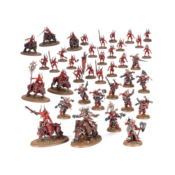 Cette boîte pleine à craquer est parfaite pour entamer une nouvelle collection des World Eaters ou pour étoffer une armée existante que vous pourrez ensuite déchaîner dans les parties de Warhammer 40,000, en faisant des économies par rapport à un achat des kits au détail. Cette force est menée par un puissant Seigneur sur Juggernaut, dont le rôle principal et de charger au combat pour prélever les têtes ennemies. Le gros de la force est constitué de Sanguinaires et de Berzerks de Khorne, des fantassins agressifs qui submergent le champ de bataille sous une vague de violence lunatique. Les Équarisseurs, des cavaliers démoniaques rapides et dévastateurs, soutiennent l’armée en s’attaquant aux cibles les plus résistantes, tandis qu’un Maître des Exécutions vient ajouter sa redoutable puissance de frappe à vos charges d’infanterie.