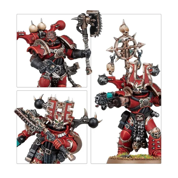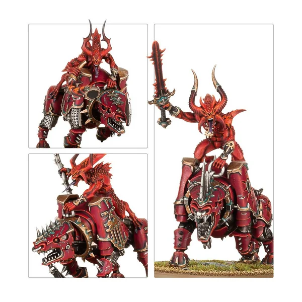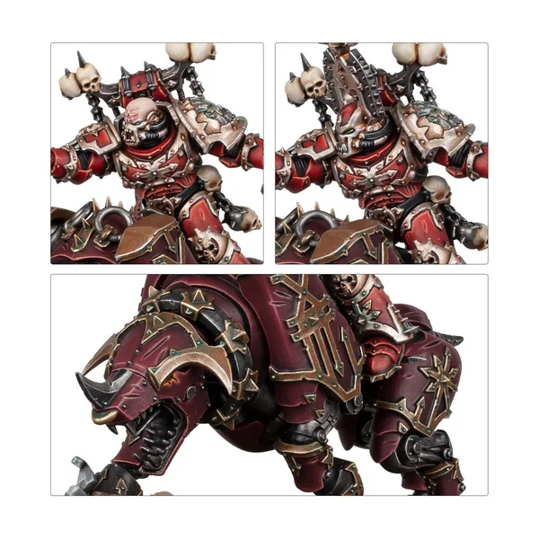 Les figurines de ce kit sont faciles à personnaliser. Le Seigneur sur Juggernaut brandit une lame tronçonneuse exaltée sous la forme d’une vicieuse épée tronçonneuse ou d’une longue hache tronçonneuse, et il est également armé d’un pistolet à plasma. Il peut être assemblé en train de brandir ce dernier vers l’ennemi ou en train de tenir fermement les rênes de sa monture. Le Seigneur et son destrier disposent chacun d’un choix de deux têtes. La figurine peut autrement être assemblée en tant que Seigneur Invocatus, l’un des guerriers élus de Khorne.