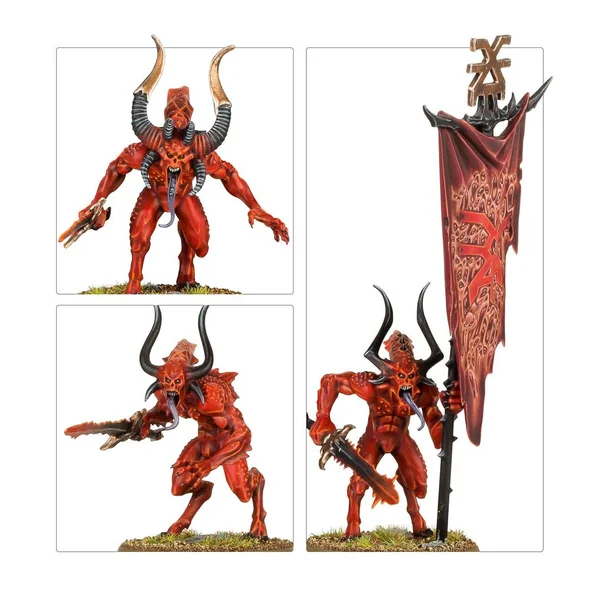 Le kit des Sanguinaires contient les éléments nécessaires pour assembler deux champions, musiciens et porte-étendard optionnels, avec chacun un choix de deux icônes. Les têtes et bras sont interchangeables sur tous les corps démoniaques du kit.