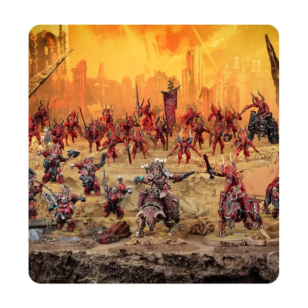 Les World Eaters, à l’image de leur divinité Khorne, ne sont pas connus pour leur subtilité. Quand ils se rendent à la guerre, ils sont souvent accompagnés d’un ost de démons assoiffés de sang à leurs côtés, prêts à moissonner des crânes pour le Trône de Crânes. Les Berzerks enragés chargent tête baissée vers le plus fort des combats, pendant que les Sanguinaires et Équarisseurs démoniaques rivalisent en actes de destruction.