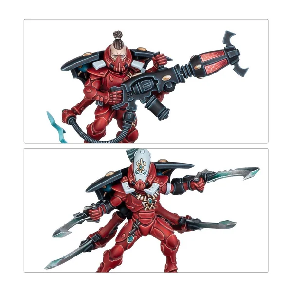 Deux des Vengeurs Lugubres peuvent être assemblés en tant qu’Exarques optionnels, qui peuvent être armés d’une catapulte shuriken, de deux catapultes shuriken, d’une lame funeste et d’un pistolet shuriken ou d’une arme énergétique et d’un bouclier miroitant. Chaque Exarque peut également porter une bannière dorsale optionnelle, et dispose d’un choix de deux têtes, une tête nue et une tête casquée, pour personnaliser plus facilement vos chefs d’escouade.