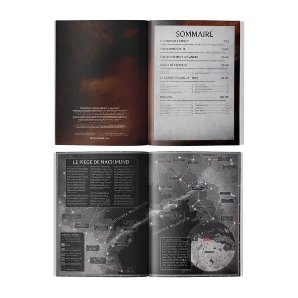 LES VOIES DE LA RUINEUne présentation narrative du contexte, du sillage de destruction qui a mené jusqu’à l’assaut hérétique sur le Mur Sanctus, et des préparatifs des défenseurs loyalistes. Cette impitoyable guerre pour la survie vous est racontée par le biais d’histoires, de cartes, d’illustrations, et d’un aperçu complet des forces en présence sur Sangua Terra.