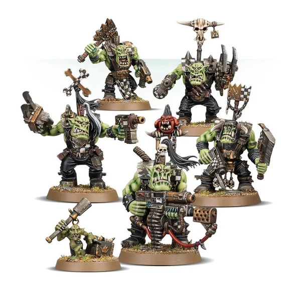 Cette boîte contient 5 Ork Nobz en plastique à monter. Ce kit en 104 composants propose 10 variantes de tête, cinq moitiés avant de torse différentes et cinq variantes de corps pour vous permettre d’assembler une bande à l’aspect unique. L’éventail d’options d’armes comprend des gros kikoup’, des pinces énergétik’, des armes kombinées fling’/lance-rokettes, une arme kombinée fling’/karbonizator, des kalibr’ et des kikoup’. Il y a en outre une foule de composants pour personnaliser davantage votre bande, dont des pièces pour gratifier vos Nobz de corps cyborks, et les faire accompagner d’un Grot bastos. Figurines fournies avec des socles ronds de 32 mm.