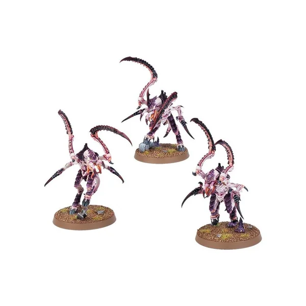 Ce kit plastique permet d’assembler trois Bondisseurs de Von Ryan, de terrifiantes créatures d’embuscades tyranides. Ces créatures jaillissent de leur cachette pour déchiqueter leur proie insoupçonneuse à l’aide de leurs griffes acérées, dont deux bras semblables à ceux d’une mante religieuse, et qui rappellent les bioformes plus grosses de Lictors. Puis elles se repaissent de leurs victimes à l’aide de crocs, de mandibules et de vrilles sensitives.