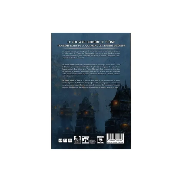 Le Pouvoir derrière le Trône est le troisième volume de la campagne révisée et mise à jour, le Director’s Cut de L’Ennemi Intérieur, l’une des plus célèbres campagnes de jeu de rôle. Le Pouvoir derrière le Trône débute là où s’achève Mort sur le Reik, entraînant vos héros dans les hauts-lieux du pouvoir à Middenheim, la cité d’Ulric. Au beau milieu des distractions et des réjouissances du carnaval de la ville, certains ont décidé que le « moment convenu » était enfin arrivé.